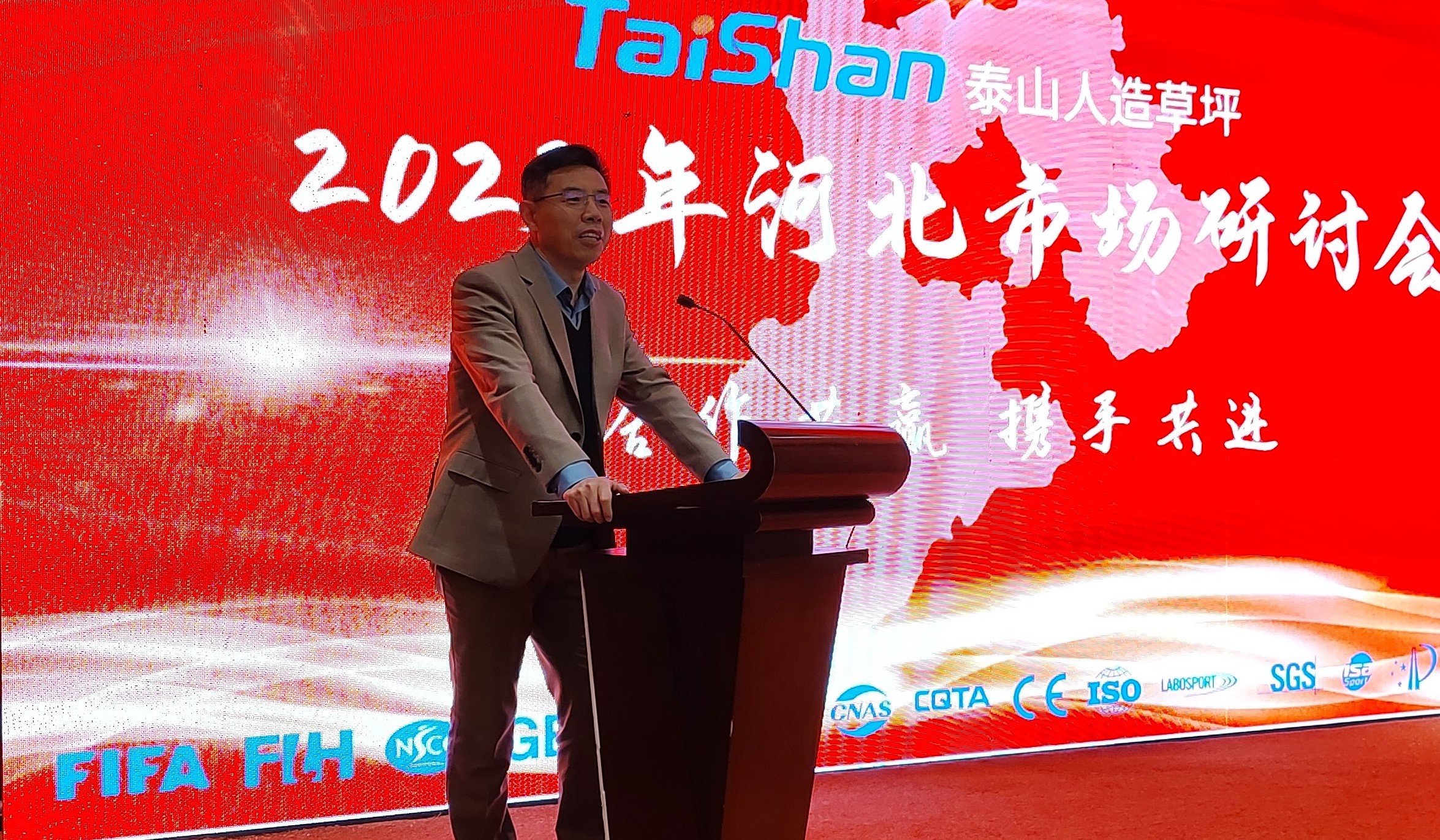研讨会上,好体育综合官网产业集团总裁卞笑男发表致辞,对与会领导及广大客商的大力支持表示感谢。他表示,过去一年是充满挑战的一年,泰山人造草坪根据市场情况及时调整战略,在大家的共同努力下,取得了不俗的成绩。今年我们将进一步开展人造草坪市场工作,重点推行年终奖励机制,与各位伙伴携手同行、再创佳绩。
